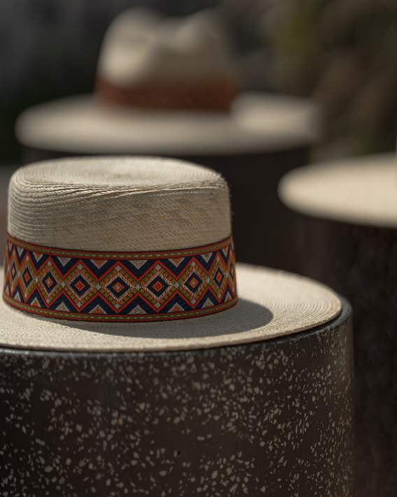 Sombrero cordobés con cinta de rombos rojos, con azules y dorados.