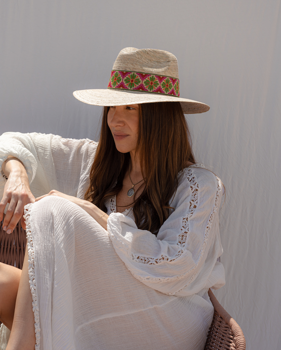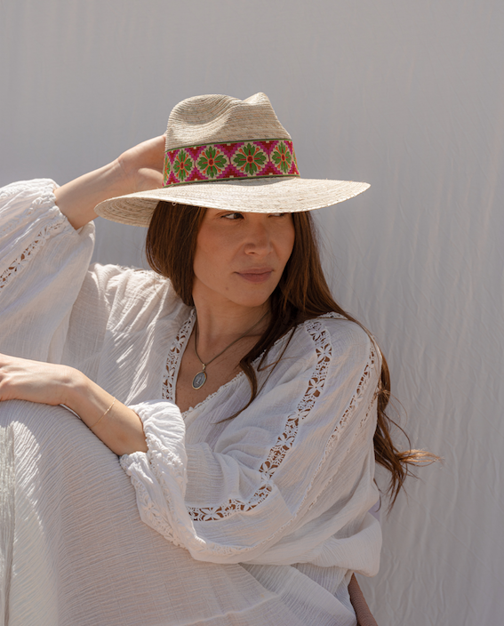 Sombrero vaquero con cinta de flores verdes, sobre naranjas y rosas.